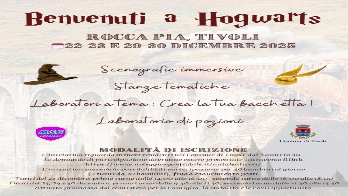 Per le festività natalizie, la Rocca Pia di Tivoli si trasforma in una vera e propria scuola di stregoneria, pronta ad accogliere bambini e bambine in un percorso esperienziale ispirato al mondo di Hogwarts. L’iniziativa, organizzata dal Comune di Tivoli e promossa dal Ministero per la Famiglia, la Natalità e le Pari Opportunità, è rivolta ai residenti di età pari o superiore ai cinque anni.