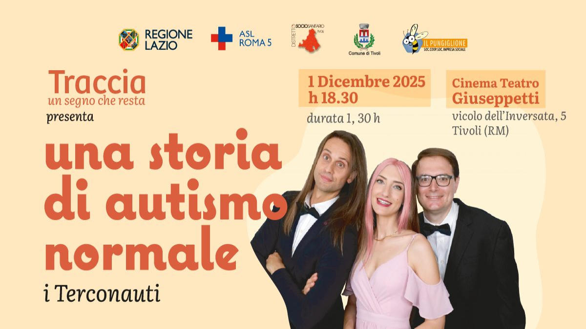 Il 1° dicembre 2025 il Cinema Teatro Giuseppetti di Tivoli ospiterà lo spettacolo dei Terconauti, l’esuberante trio composto dai fratelli Damiano e Margherita Tercon insieme a Philipp Carboni. L’appuntamento, con inizio alle ore 18.30, proporrà al pubblico un racconto intenso e coinvolgente legato al tema dell’autismo e alla forza di superare ogni etichetta attraverso creatività e autenticità.