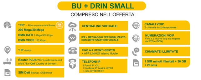 Possiamo anche aggiungere centralini virtuali a partire da 4 interni per una spesa che parte da € 74,90 al mese per 24 mesi in FTTC poi € 50 al mese o € 74,90 al mese per 24 mesi e poi € 55 al mese in FTTH.