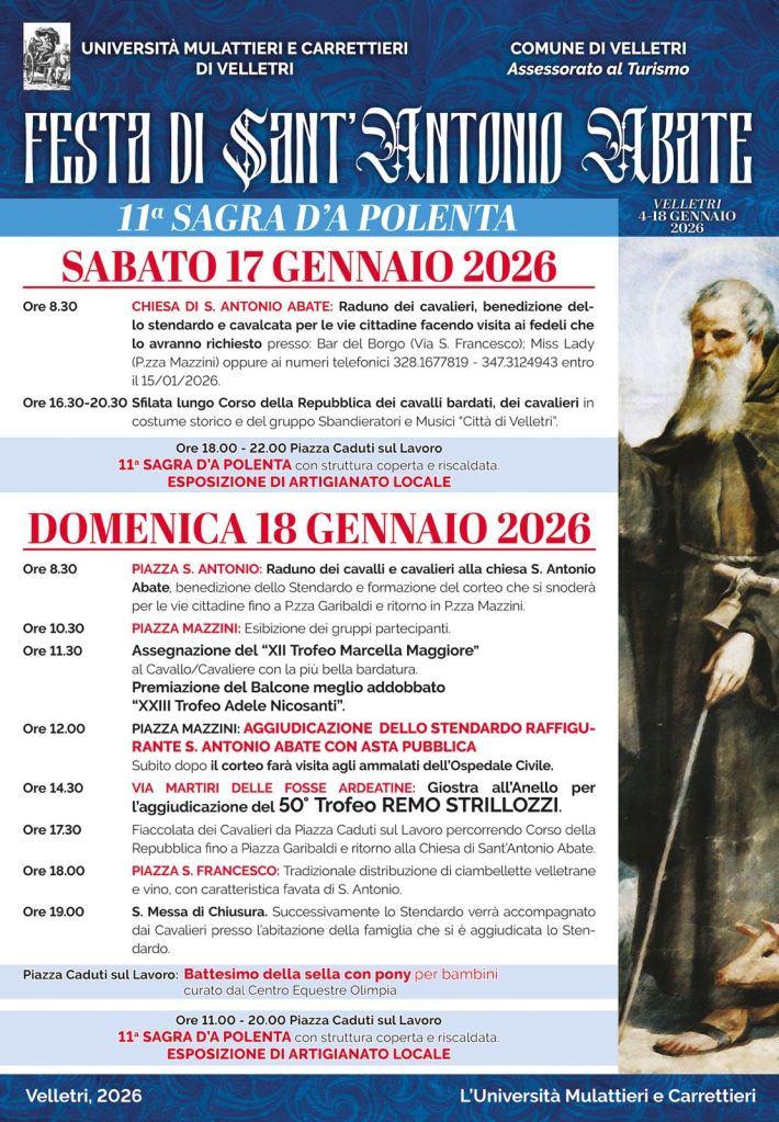Velletri si prepara a rinnovare uno degli appuntamenti più identitari e sentiti della propria tradizione con la Festa di Sant’Antonio Abate, organizzata dall’Università Mulattieri e Carrettieri di Velletri con il patrocinio del Comune di Velletri – Assessorato al Turismo. La manifestazione unisce devozione religiosa, rievocazione storica e cultura popolare, coinvolgendo la città e le campagne circostanti in un percorso che intreccia spiritualità e partecipazione collettiva.