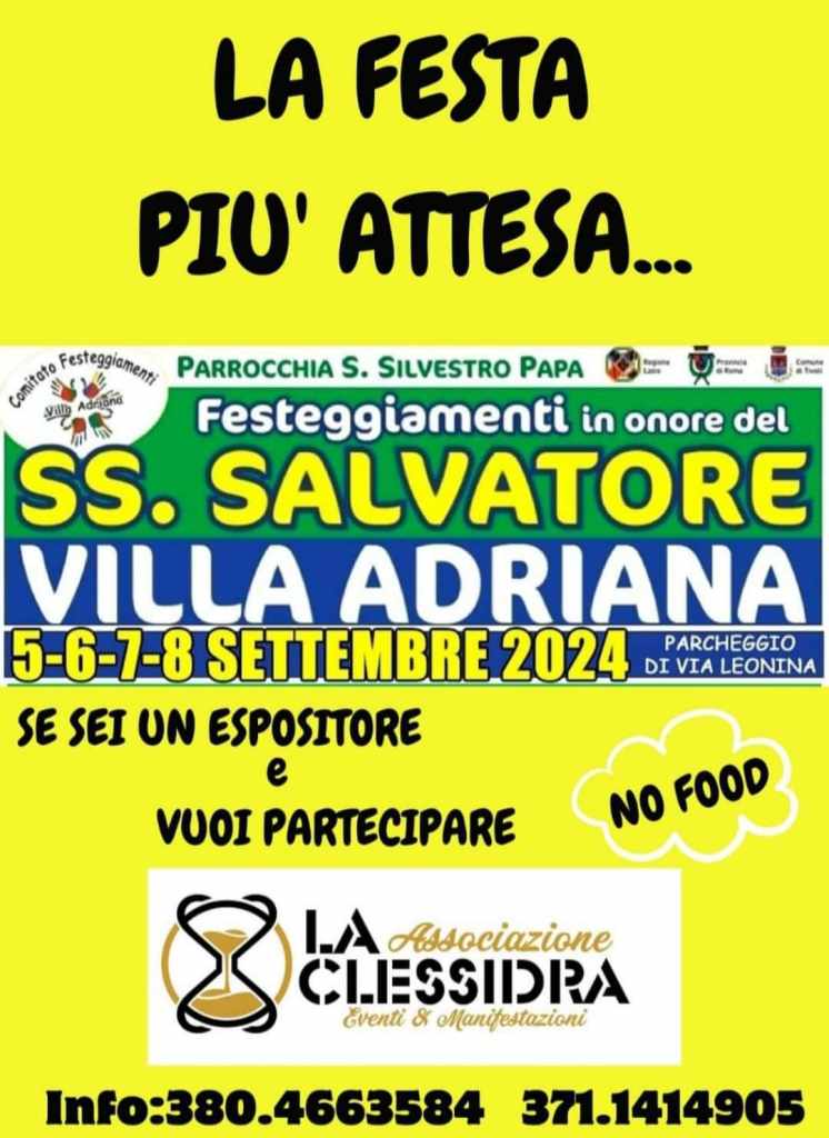 L’Associazione Culturale La Clessidra ha annunciato le date della festa più attesa dell’anno, del Santissimo Salvatore, che si svolgerà dal 5 all’ 8 settembre, presso il parcheggio di Via Leonina, a Villa Adriana, promettendo un programma ricco di sorprese e divertimento. I dettagli del programma saranno presto disponibili, ma gli organizzatori anticipano che sarà un evento spettacolare.