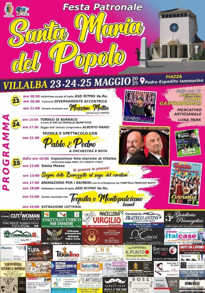 Dal 23 al 25 maggio 2025, Villalba si prepara a celebrare la Festa Patronale di Santa Maria del Popolo con un ricco programma di eventi religiosi, culturali e ricreativi, nella cornice di Piazza Padre Espedito Iammarino.