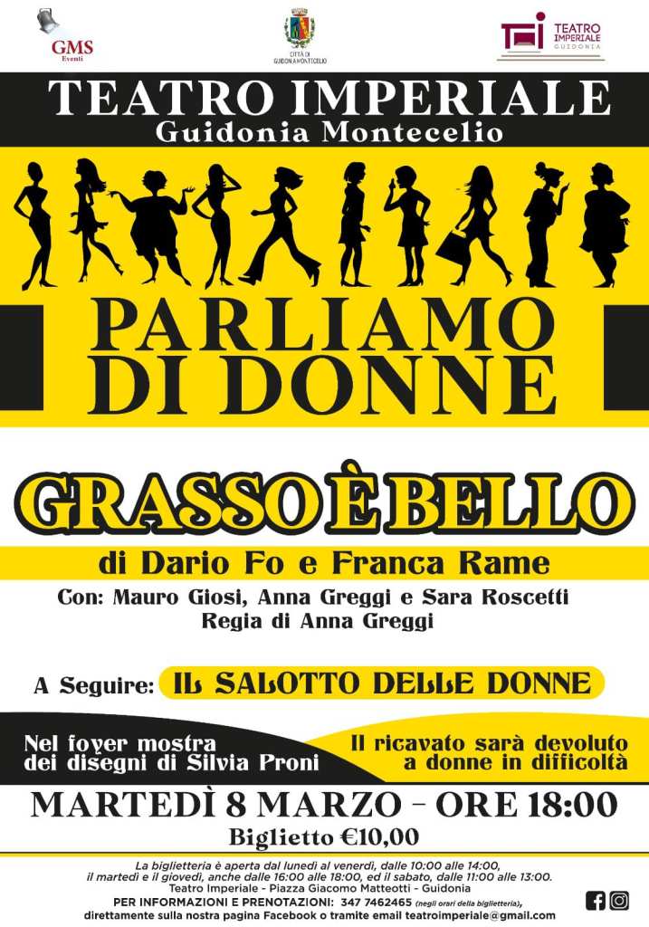 Un pomeriggio dedicato interamente alle donne sarà quello che si terrà in occasione dell’8 Marzo: Giornata Internazionale della Donna. Si inizia alle 18.00 al Teatro Imperiale con lo spettacolo “Grasso è bello” di Dario Fo e Franca Rame con la regia di Anna Greggi. Lo spettacolo avrà un costo di 10 euro che andrà a sostegno delle donne in difficoltà sul territorio di Guidonia Montecelio.